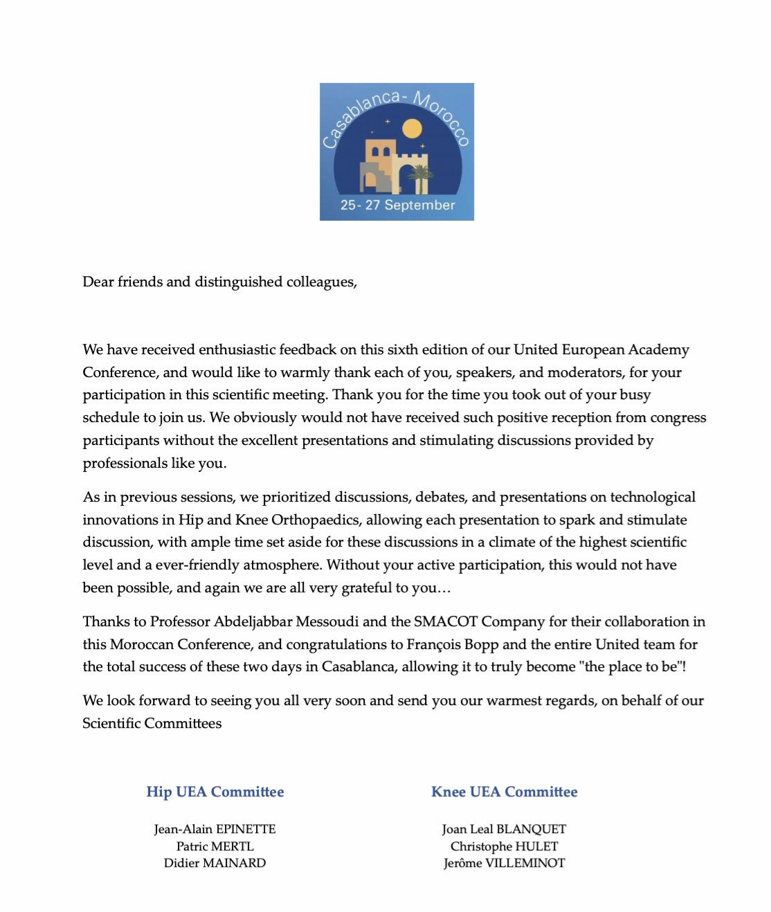 Casablanca, September 26–27, 2025EastMed took part in the 5th International Conference of the United European Academy, a major scientific event dedicated to hip and knee orthopedics.